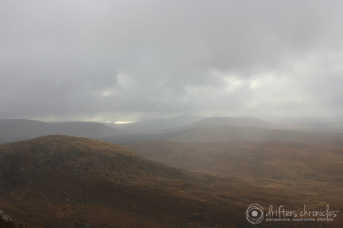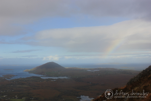 The weather started to clear up at the top of the mountain. You can even see a little rainbow in the clouds. Connemara is picturesque, the green land , blue water. Nature is beautiful.