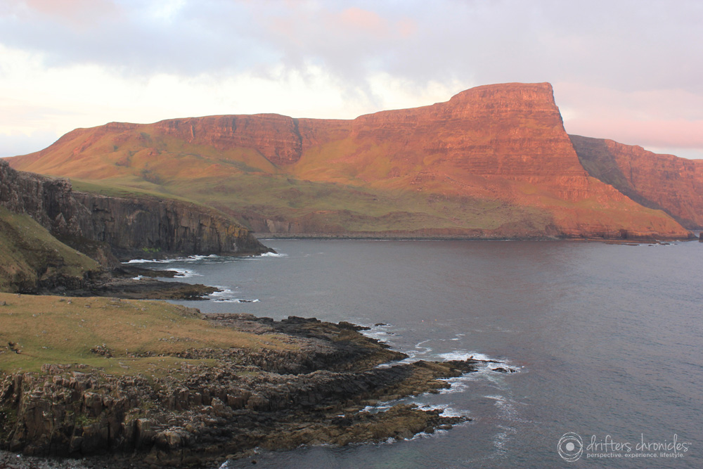On this day the sun was shining bright and I knew this would be an amazing evening to visit Neist Point. I’ve seen pictures online and knew this was somewhere I wanted to stop given the opportunity. The roads are so skinny in Scotland, so much so that we had to pull over every time a car was coming in the opposite direction. We did lots of hiking and this was just a short walk to get to the lighthouse, about 45 minutes round trip. Neist point is located on the North Western portion of the Isle of Skye and takes about 45 minutes to get to from Portree which is one of the main towns on the island.